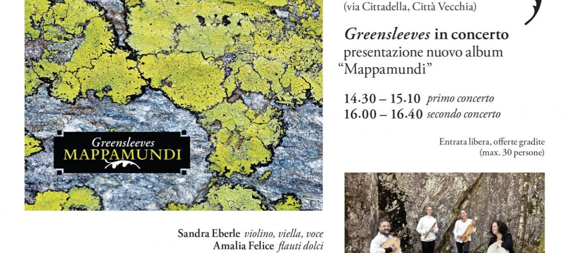 L'ensemble di musica medievale e rinascimentale "Greensleeves" (S. Eberle, A. Felice, C. Garbani, P. Tomamichel) presenta il suo nuovo album "Mappamundi" durante due momenti: alle 14.30 e alle 16.00. Si potrà scoprire il repertorio del disco ascoltando un concerto in chiesa di ca. 40', a seguire una chiacchierata nel cortile adiancente con gli artisti e la possibilità di acquistare il cd.