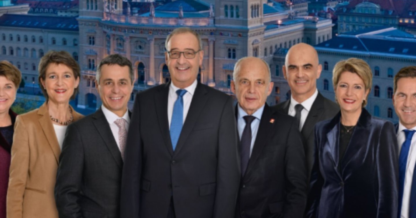 La fotografia ritrae i sette consiglieri federali e il cancelliere della Confederazione in gruppo