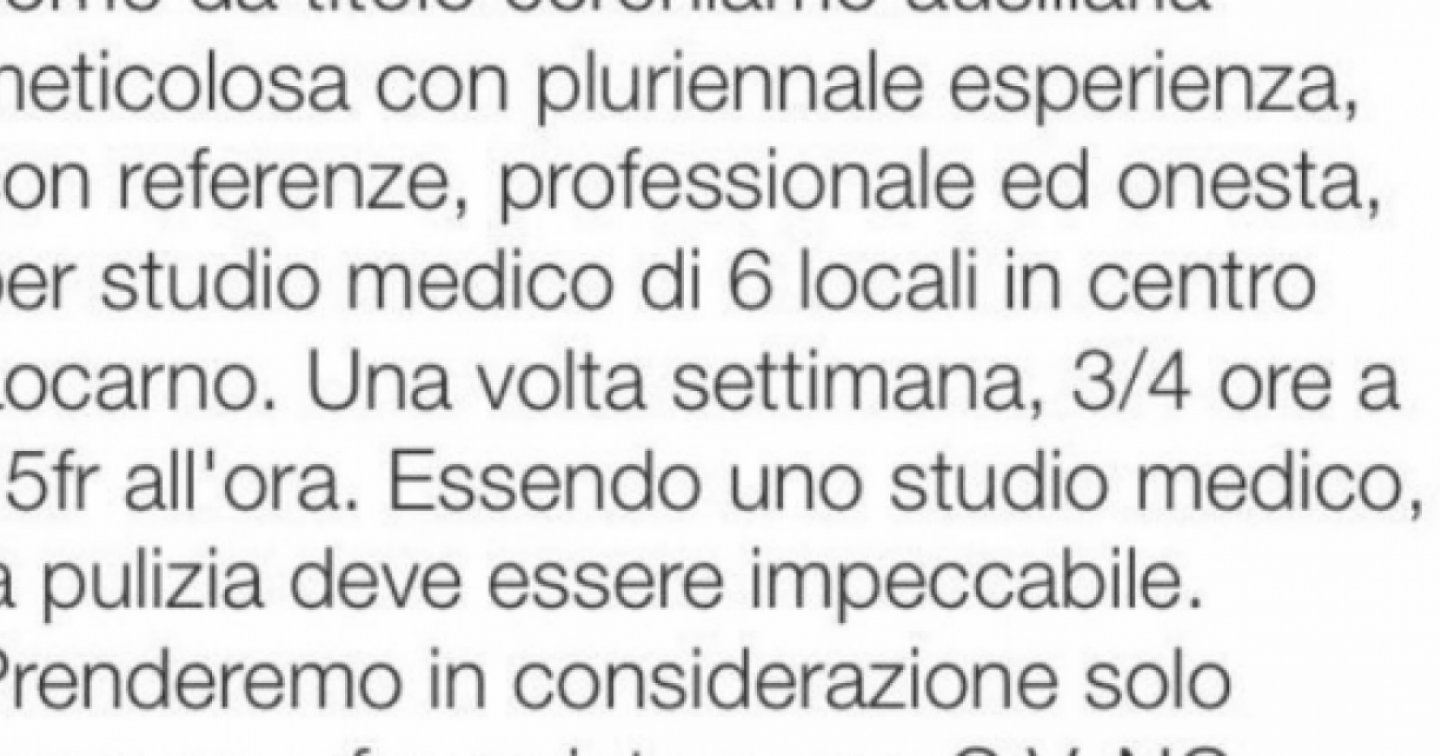 LOCARNO – Ecco l’ennesimo caso di un annuncio scandaloso! Su tutti.ch viene segnalata (da un lettore al sito TicinoResidenti) la richiesta da parte di uno studio medico di Locarno, di sei locali. Vuole qualcuno che si occupi della pulizia, una volta la settimana per circa 3-4 ore.