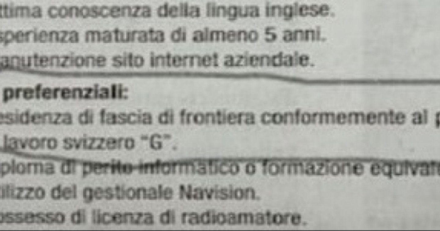 Ma il problema arriva quando si passa ai titoli preferenziali. Oltre ai diplomi e alla conoscenze di altre lingue, c’è “residenza di fascia di frontiera conformemente al permesso di lavoro svizzero ‘G’”. Dunque, l’azienda di Balerna cerca prevalentemente frontalieri!