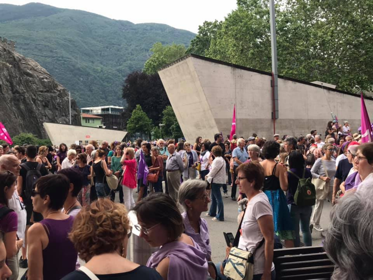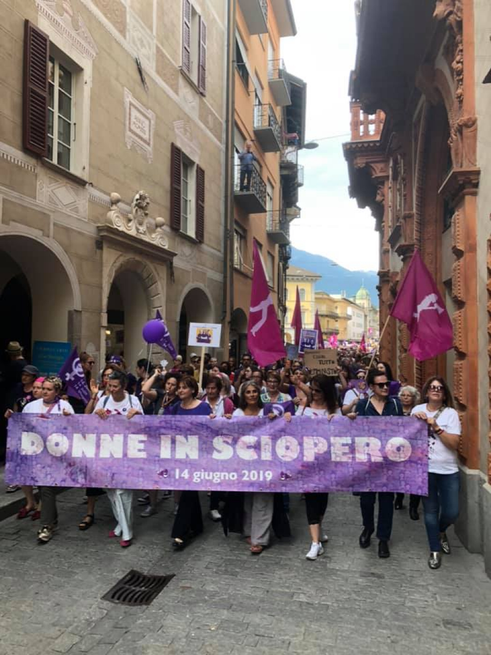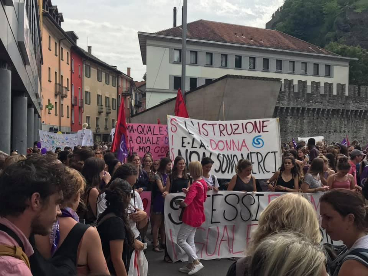 Alla manifestazione partita alle 17:30 da Piazza del Sole sono presenti donne e uomini di ogni età (moltissimi i giovani) e provenienza, con decine di striscioni e cartelli inneggianti alla parità e contro ogni forma di discriminazione, sessismo e violenza nei confronti delle donne. Una "manifestazione imponente che il Ticino ricorderà per un pezzo", commenta Chiara Landi, sindacalista Unia e presidente delle donne USS Ticino e Moesa.