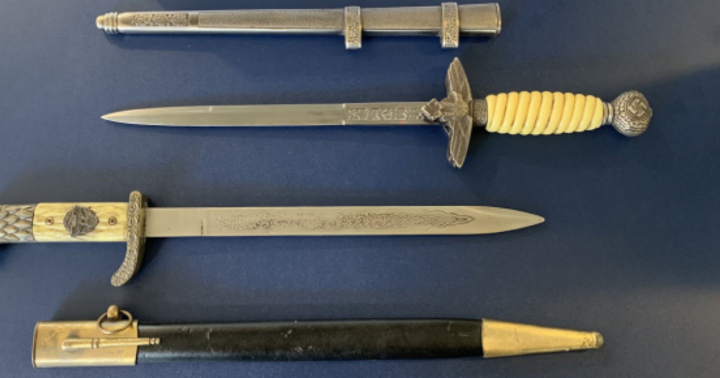Nel bagagliaio dell’auto, all’interno di una borsa, gli agenti hanno trovato due pugnali di propaganda nazista: uno imitazione di uno stiletto con raffigurate tre svastiche naziste e l’altro imitazione di una spada, con raffigurata un’aquila nazista. I pugnali, lunghi entrambi 38 centimetri, sono stati sequestrati come oggetti pericolosi.