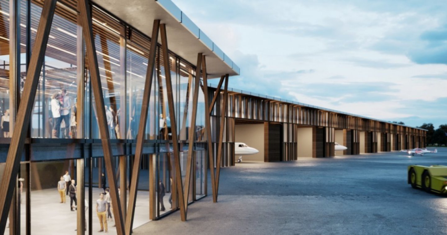 La costruzione è contraddistinta dalla semplicità e sostenibilità del progetto che prevede l’utilizzo di materiali come legno, vetro ed una copertura di pannelli fotovoltaici. L’utilizzo del vetro permette agli hangar di inserirsi perfettamente nel paesaggio, evitando di fatto di creare una barriera antiestetica ai comuni vicini. Infine i pannelli fotovoltaici permettono pressoché la totale copertura del fabbisogno energetico dell’intera struttura, così come potrebbero fornire energia a parte dell’aeroporto.