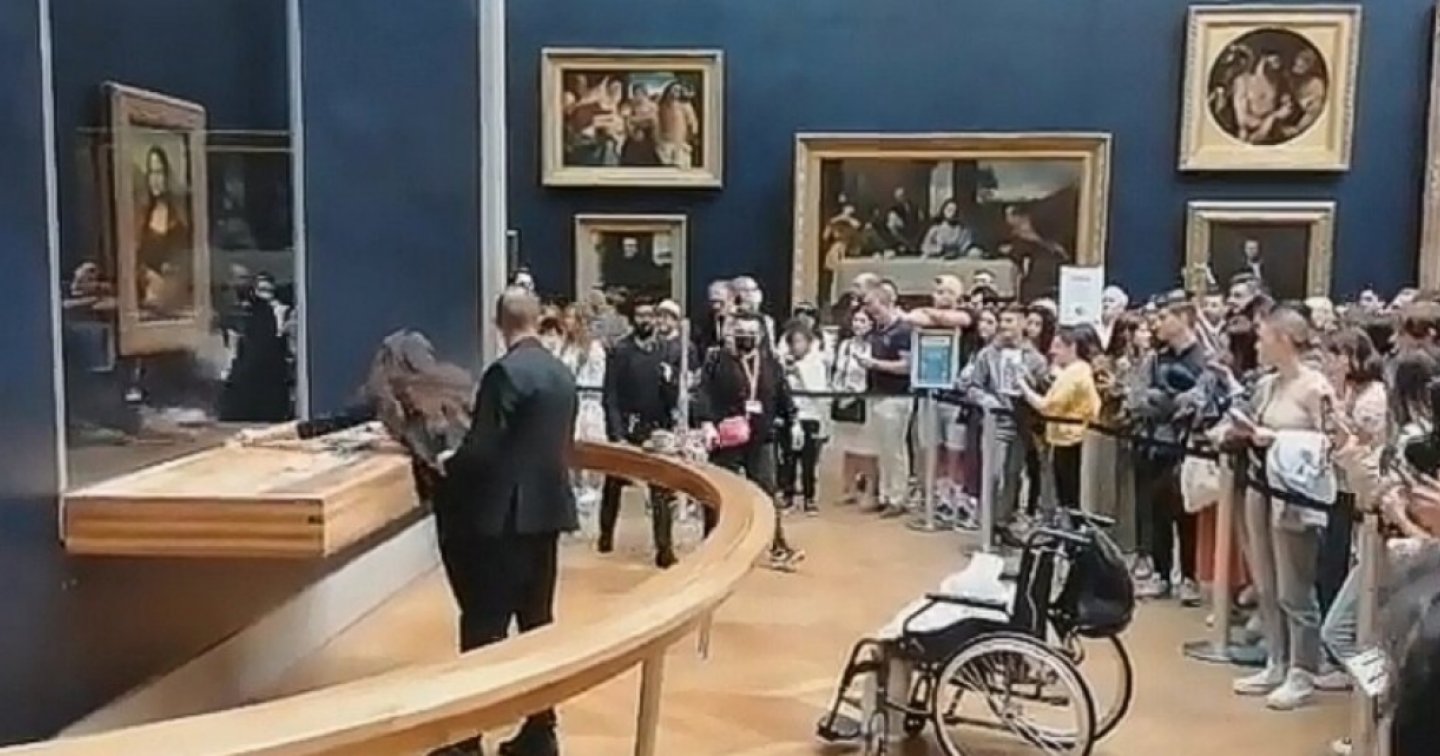 Si tratterebbe di un atto dimostrativo per sensibilizzare sulla protezione ambientale. Nessun danno per la Monna Lisa, protetta da un vetro di sicurezza