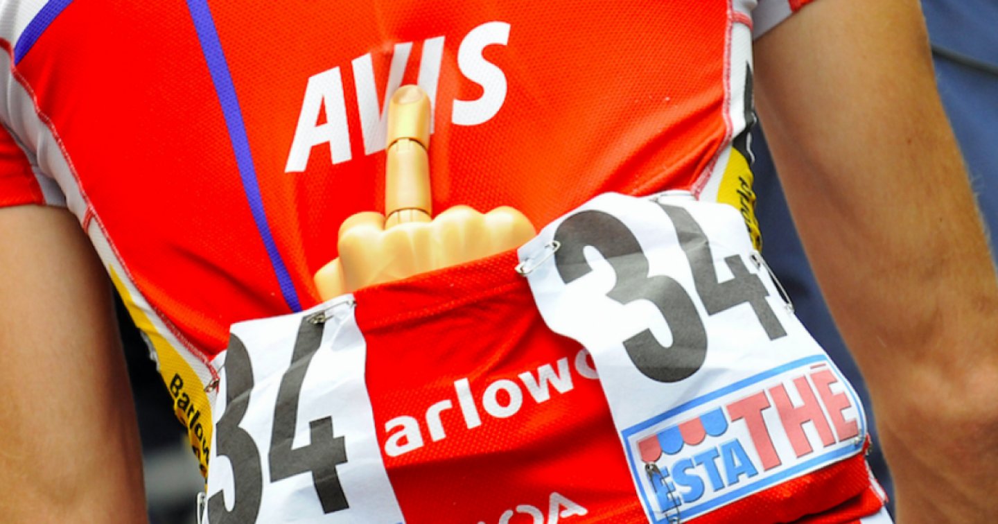 Nella foto TiPress il corridore australiano Steven Cummings con un particolare saluto per i suoi inseguitori, una mano finta con il dito medio alzato