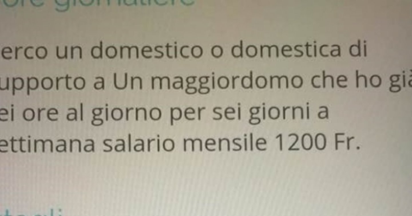 L’annuncio è stato ancora una volta segnalato dal gruppo Facebook TicinoResidenti. “Cerco un domestico o domestica di supporto a un Maggiordomo che ho già sei ore al giorno per sei ore a settimana, salario mensile 1'200 franchi”, si legge.
