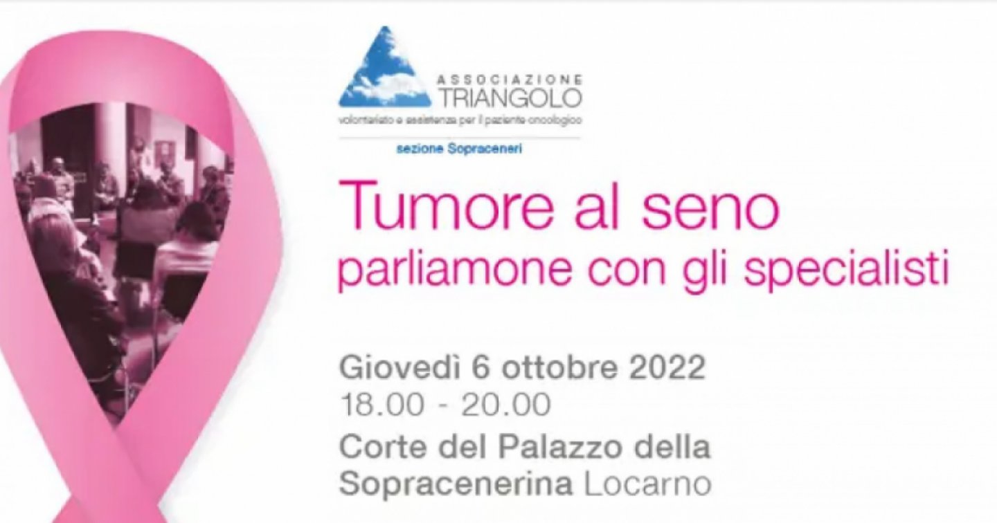 Giunto alla sua quarta edizione, l’evento si terrà giovedì 6 ottobre dalle 18 all 20 nella Corte del Palazzo della Sopracenerina a Locarno. Sarà un’occasione per tutti gli interessati di informarsi, porre domande e dialogare in piccoli gruppi con diversi specialisti che si occupano del tumore al seno e dell’accompagnamento durante la malattia. Saranno a disposizione per rispondere a domande, fornire informazioni e condividere la propria esperienza: oncologo, ginecologo, radiologo, radioterapista, senologo, chirurgo plastico, psicologo, psichiatra, medico di famiglia, genetista, fisioterapista, infermiera in senologia, dietista, parrucchiera, estetista, animatrice gruppo auto-aiuto e volontari dell’Associazione Triangolo. Segue aperitivo offerto.
