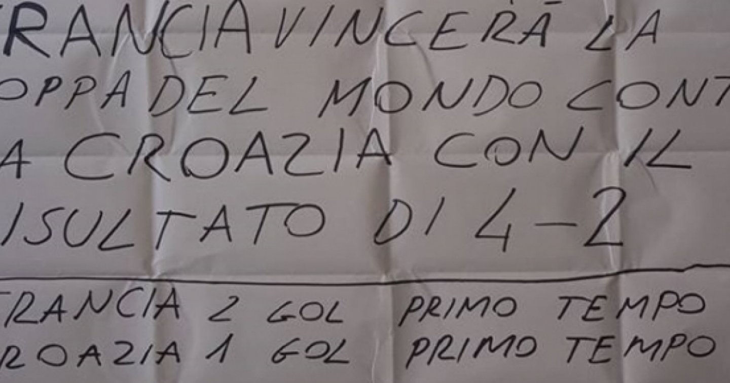 “Sì, ho messo due gol nel primo tempo e altrettanti nel secondo per la Francia e uno per tempo per la Croazia. Ricorda il video? Avevo dato degli indizi… Ora li spiego. Ho fatto la previsione il 7 luglio alle 19.07. I primi gol della Francia sono nati da un rigore e da una punizione di Griezmann, numero 7, ed ecco il 7. Gli latri due gol sono stati segnati dal 10 Mbappé e dal 6 Pogba, dunque 10 più 6 fa 16 e 1 più 6 va 7, ovvero il mese di luglio. Invece l’ora: Perisic ha segnato al 28’, Mandzukic al 69’, se facciamo 28 più 69 fa 97, e 9 più 7 fa 16, con 1 più 6 che dà 7. Oppure calcoliamo 2 più 8 più 6 più 9 abbiamo 25, che dunque è sempre 2 più 5! Un altro indizio era il fatto che ho inserito la previsione nella cassaforte poco prima del fischio d’inizio di Croazia-Russia. Tifosi di queste due nazioni, ora? A livello di gioco avrebbe meritato la Croazia, fondamentalmente io tifo Svizzera, mi auguravo ci fossero stati i rossocrociati. Non sono appassionato di calcio, però per un anno ho dovuto seguire qualificazioni, amichevoli e partite. Mi hanno detto che con la Francia era facile, quindi ho voluto mettere anche i gol per tempo”.