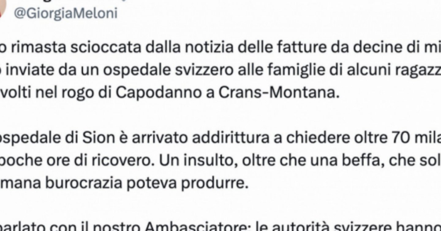 Ma torniamo a Meloni. Questo il suo post: “Sono rimasta scioccata dalla notizia delle fatture da decine di migliaia di euro inviate da un ospedale svizzero alle famiglie di alcuni ragazzi coinvolti nel rogo di Capodanno a Crans-Montana. Un ospedale di Sion è arrivato addirittura a chiedere oltre 70.000 euro per poche ore di ricovero. Un insulto, oltre che una beffa che solo una disumana burocrazia poteva produrre”.