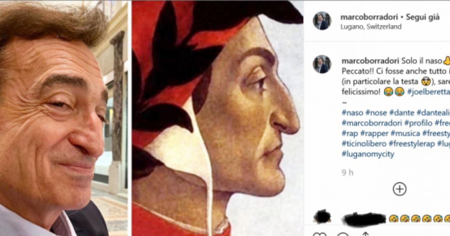 Il sindaco di Lugano ha mostrato di saper prendere in giro sé stesso. In un post su Instagram, si è fotografato di profilo, paragonando realmente il suo naso a quello del celebre Alighieri.